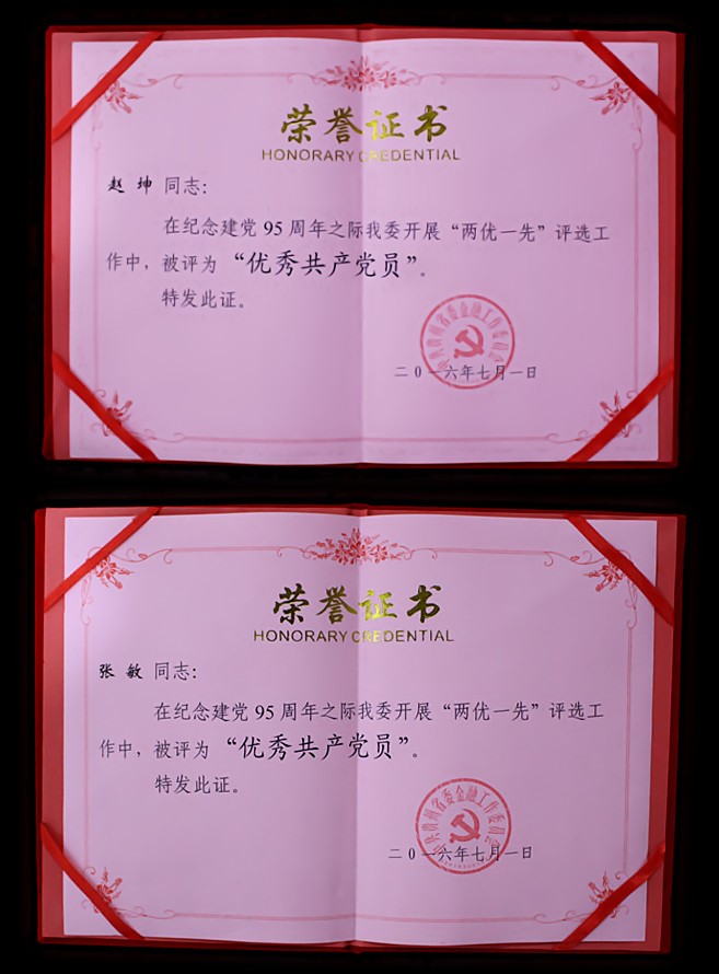 (图:优秀共产党员荣誉证书)