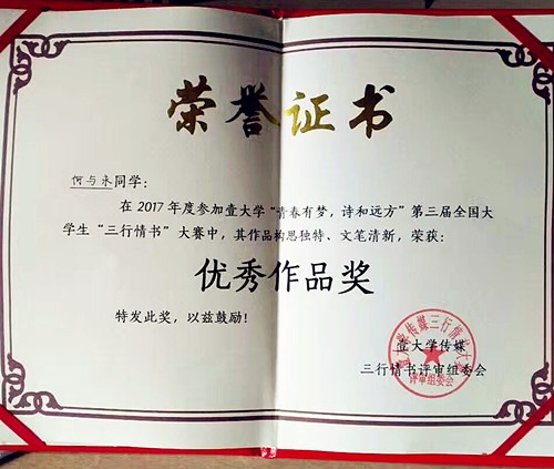 (图:何与永同学的获奖证书)